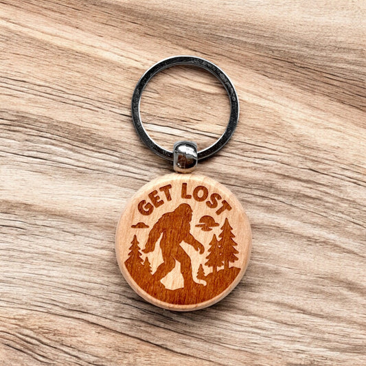 Get Lost Bigfoot Wooden Keychain