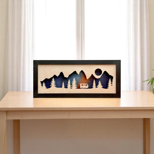 Mountain Camping Wooden Wall Art Framed Night Scene – Tent, Camper, or 5th Wheel
