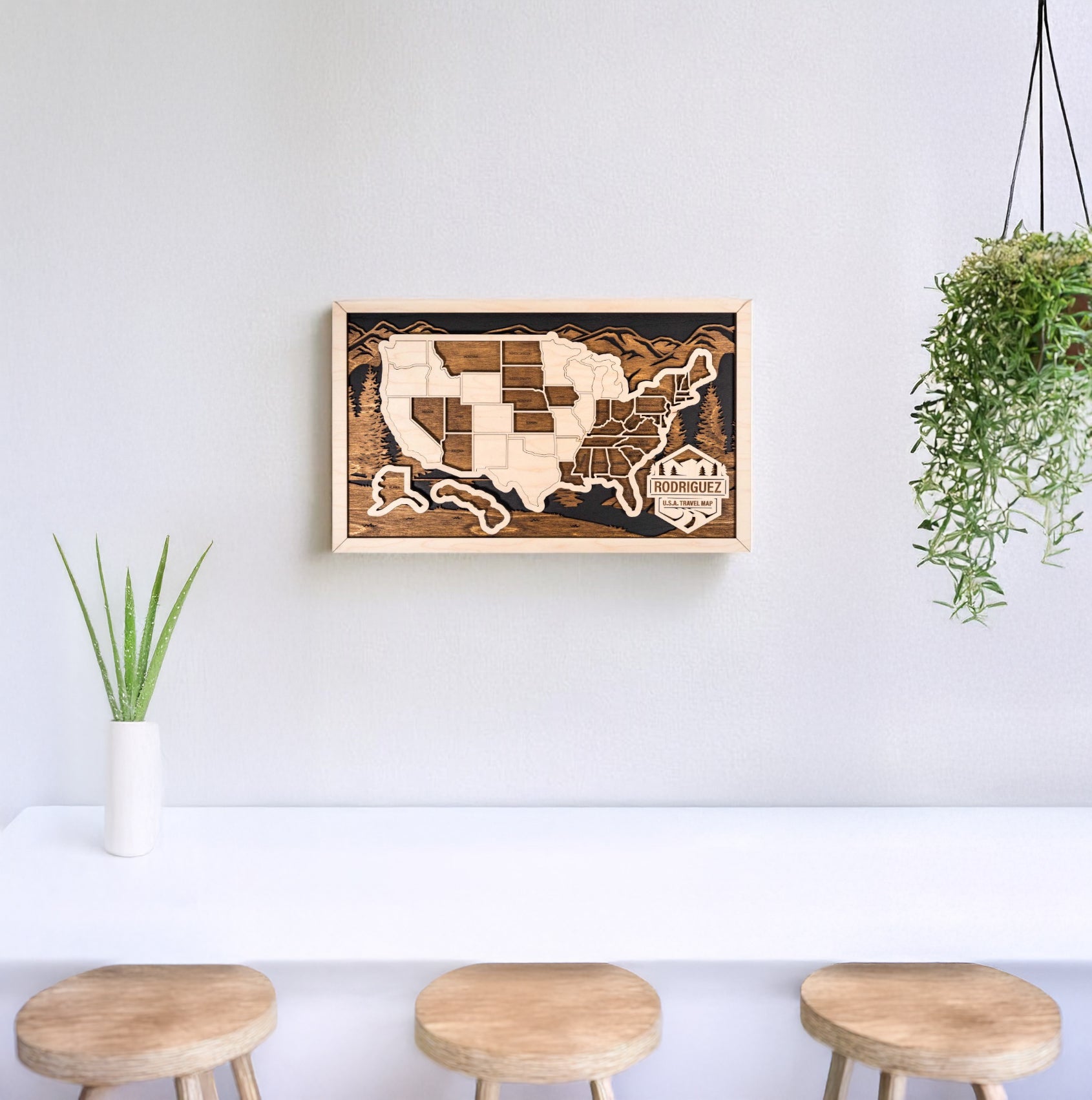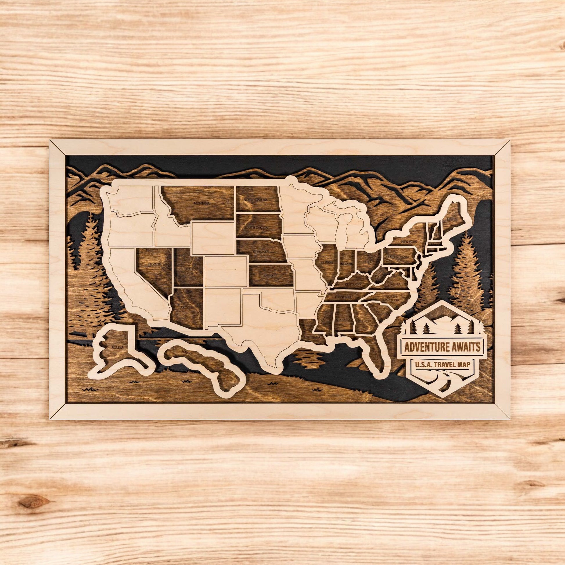 Track your journeys across the United States with this stunning personalized wooden USA Travel Map. Perfect for travelers and adventurers, this map features laser-cut state pieces with 3M adhesive backing for easy placement. With options for customization, such as adding your family name or the “Adventure Awaits” badge, this handcrafted wall art serves as a unique décor piece and a memorable gift. The intricate mountain and forest design adds a touch of nature, making it ideal for showcasing your travel experiences.